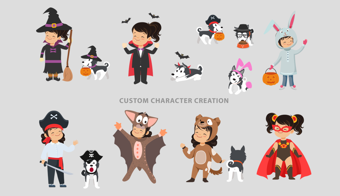 To capture their mission of encouraging safe Halloween celebrations and trick-or-treating for kids, we created custom characters, a girl, a dog and other costumed revelers, to be used on the website and in social materials.
