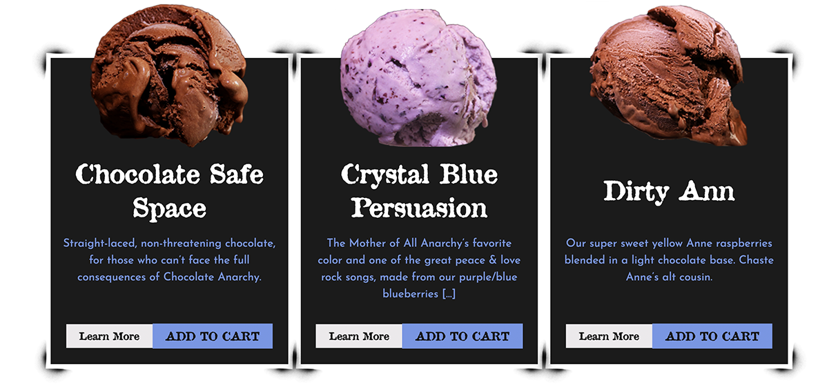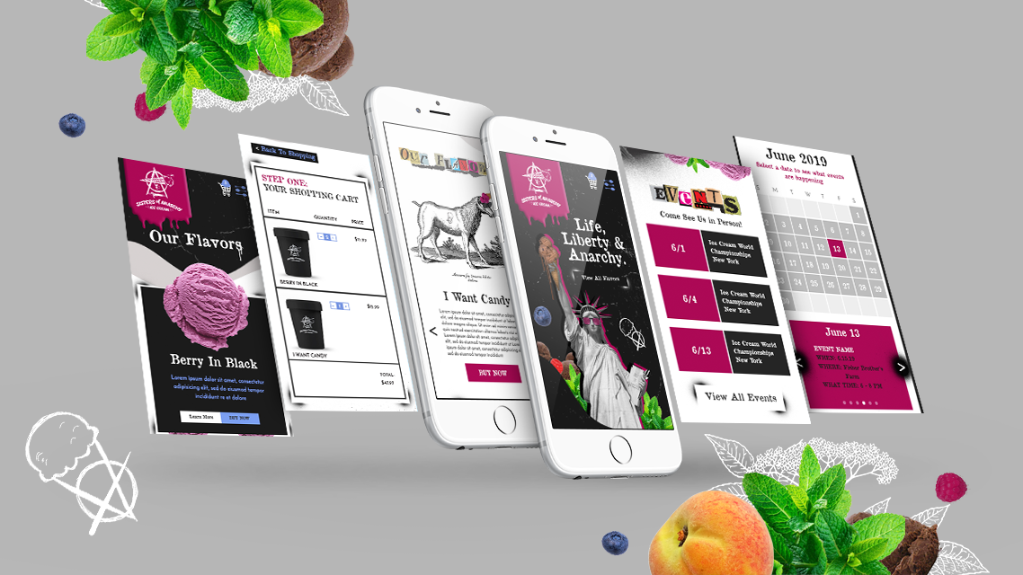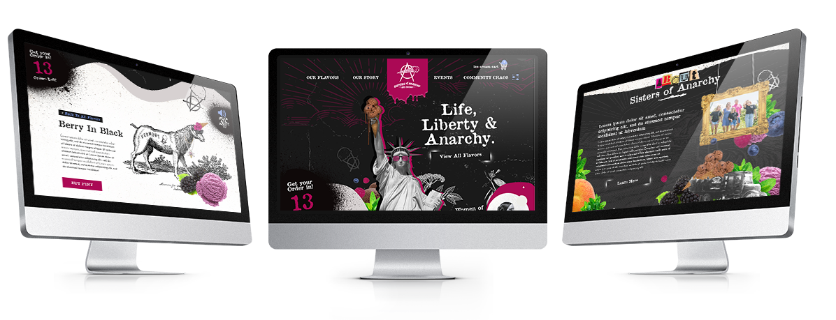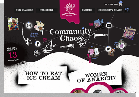 Bob and Becky came to us with an exciting goal: to bring their farm-to-cone, Vermont-made ice cream to the forefront of the industry, while also communicating their rebellious philosophy with an extra serving of attitude. We were psyched to help this spunky, women-led company spread their message across the nation. With cheeky, musically-inspired flavors like “Black Velvet,” “Purple Haze,” “I Really Love Your Peaches,” and their flagship “Chocolate Anarchy” (honestly, the best chocolate ice cream we’ve ever wrapped our spoons around,) Sisters of Anarchy had a loud voice and a kick-ass message that lit our creative fire. Along with a complete visual makeover, website redesign, and brand marketing discovery, we took Sisters of Anarchy to the next level – serving their irreverent wit to the internet, deliciously, with a cherry on top.