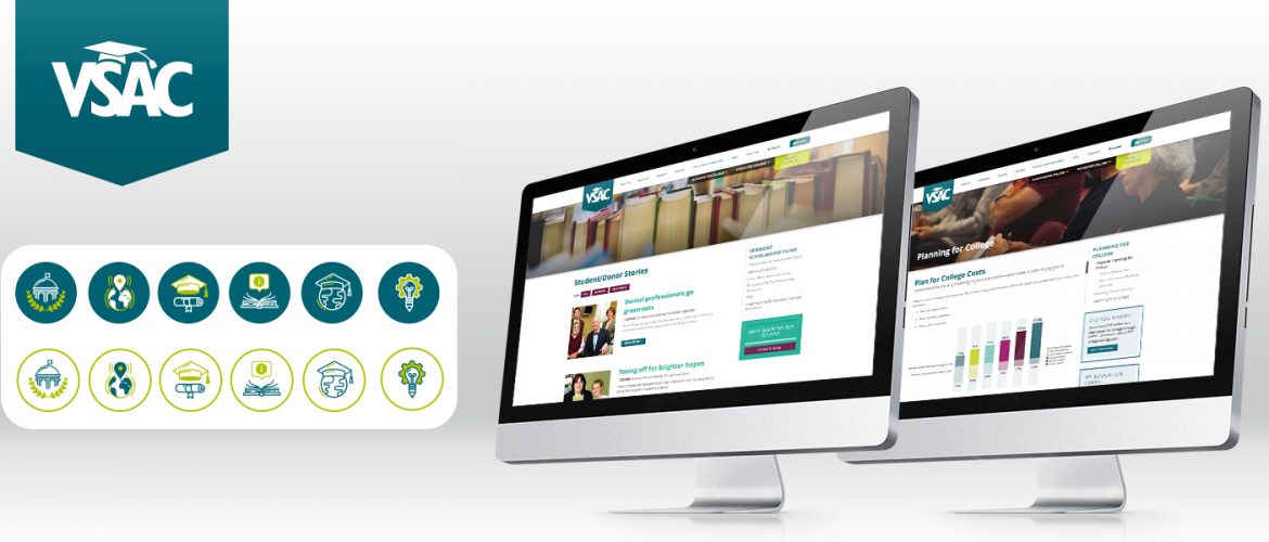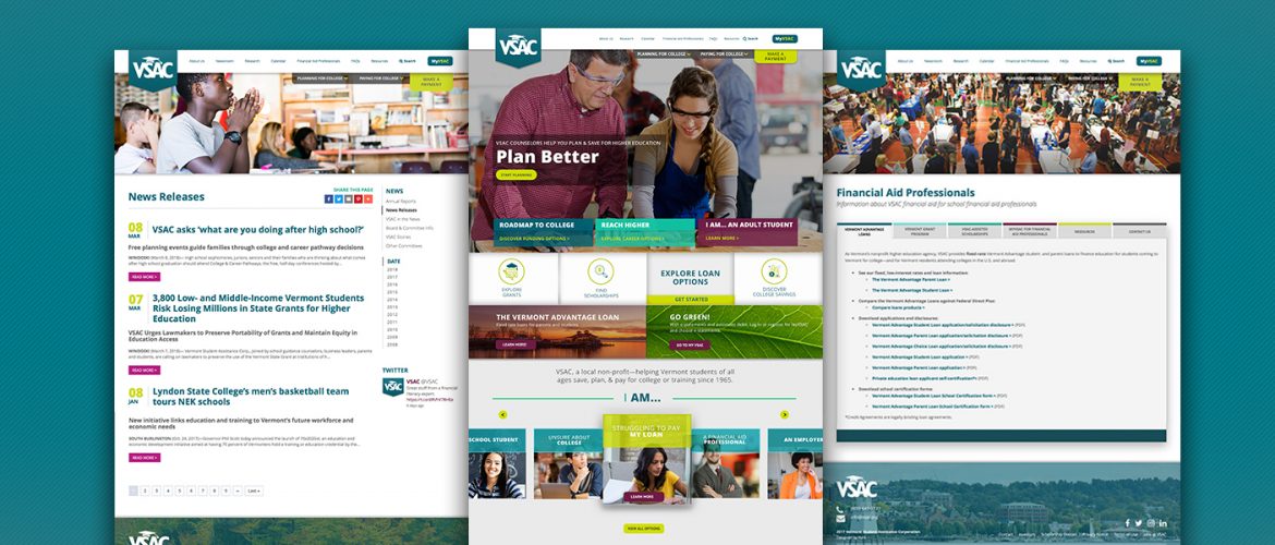 The Vermont Student Assistance Corporation (VSAC) helps support Vermont-based students and their families meet education and career goals by offering financial aid, student loans, and grants, along with resources for college and career planning. Hark’s partnership with VSAC has been monumental in helping define new and innovative marketing goals, building user and search-optimized web experiences on VSAC’s Hark-designed website, and establishing a standard of growth in brand recognition and reputation. We worked with VSAC to modernize their existing site by adding bold pops of color, eye-catching animated graphics, and user-friendly features for easy site navigation. The branding discovery in the initial phases of the partnership eventually translated into new marketing campaigns, continual digital and print collateral creation, and ever-evolving web content. Reinforcing the idea that higher education is within reach to all Vermonters, our design and development teams came together to build a visually cohesive brand identity that communicates VSAC’s mission to empower students of all ages to reach their educational and career planning goals.