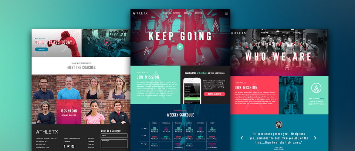 The goal for Athletx was to bring their brand to life using a range of bold colors from bright teal to hot pink. Various textures, patterns, and color overlays were used to amp up the action-packed photography shot by our in-house photographer. The interactive design encourages users to scroll throughout the site while also providing a well-rounded intro to what the Athletx community is all about.